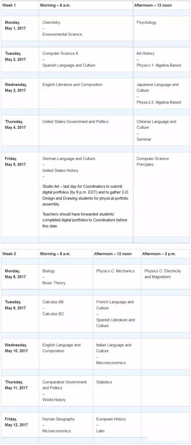 4)2017年增加8月考试,未来三年的考试日期小编也从CB官网搬了过来,如下。需注意:官网显示的是“anticipated”,并不是最终确定的时间。
